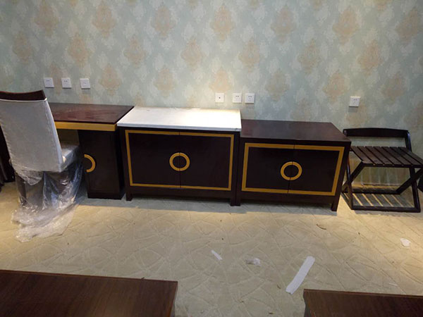 張家口酒店家具臺面不下彎變形,產品經久耐用;臺面中抽上方按表面油漆處理;寫字板皮面無使用水粘貼。